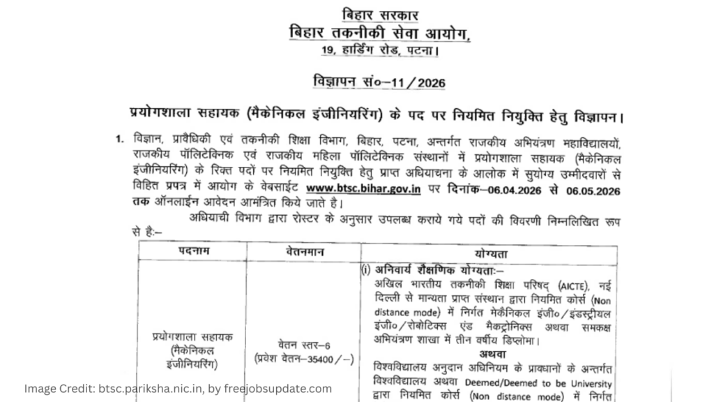 BTSC Recruitment 2026, The Bihar Technical Service Commission (BTSC) has officially released the Laboratory Assistant Recruitment 2026 notification. This is a great opportunity for candidates looking for government jobs in Bihar, especially in technical and engineering fields. A total of 1090 vacancies have been announced across multiple disciplines. Interested candidates can apply online from April 6, 2026, to May 6, 2026 through the official BTSC website.