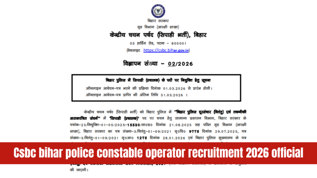 CSBC Constable Recruitment 2026: The Central Selection Board of Constable (CSBC) has officially released the notification for Bihar Police Constable (Operator) Recruitment 2026 under Advertisement No. 02/2026. This recruitment drive aims to fill 993 vacancies in the Bihar Police Radio Organization. Interested candidates can apply online through the official website Central Selection Board of Constable from 01 March 2026 to 31 March 2026. On freejobsupdate.com, we bring you complete details including eligibility, vacancy distribution, selection process, important dates, and direct links.