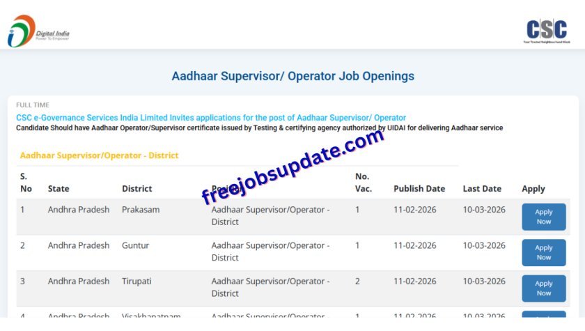 CSC Aadhaar Supervisor Operator Recruitment 2026 Post Details