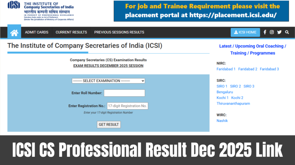 ICSI CS Professional Result Dec 2025 Link has been officially declared by the Institute of Company Secretaries of India (ICSI) on February 25, 2026. Candidates who appeared for the CS Professional Programme (Syllabus 2022) examination can now check and download their results from the official website – icsi.edu.