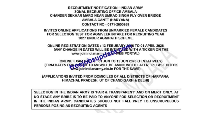Indian Army Agniveer Women Recruitment 2026, The Indian Army has officially released a new recruitment notification for Agniveer (Women Military Police) under the Agnipath Scheme 2027. This rally is being conducted by Zonal Recruiting Office Ambala, and online applications are now open. If you are an unmarried female candidate from Haryana, Himachal Pradesh, Delhi, or Chandigarh, this is your golden opportunity to serve the nation. Let’s break down everything in a simple, user-friendly format so you don’t miss any important detail. (For fast updates, always check freejobsupdate.com)