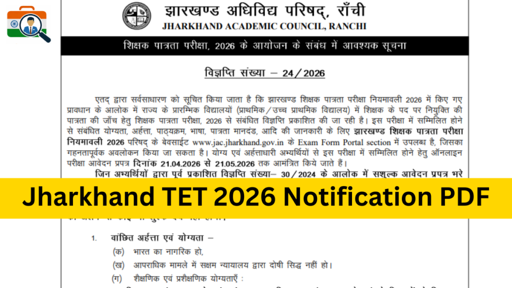 Jharkhand Teacher Eligibility Test 2026 (JTET 2026), has been officially announced by the Jharkhand Academic Council under Advt. No. 24/2026. This examination is a crucial opportunity for candidates aspiring to become government teachers in Jharkhand for Primary (Class 1-5) and Upper Primary (Class 6-8) levels. According to the official notification, the application process has started from April 21, 2026, and will continue till May 21, 2026. Interested candidates can apply online through the official website. This article by freejobsupdate.com provides complete information in a simple and user-friendly format.