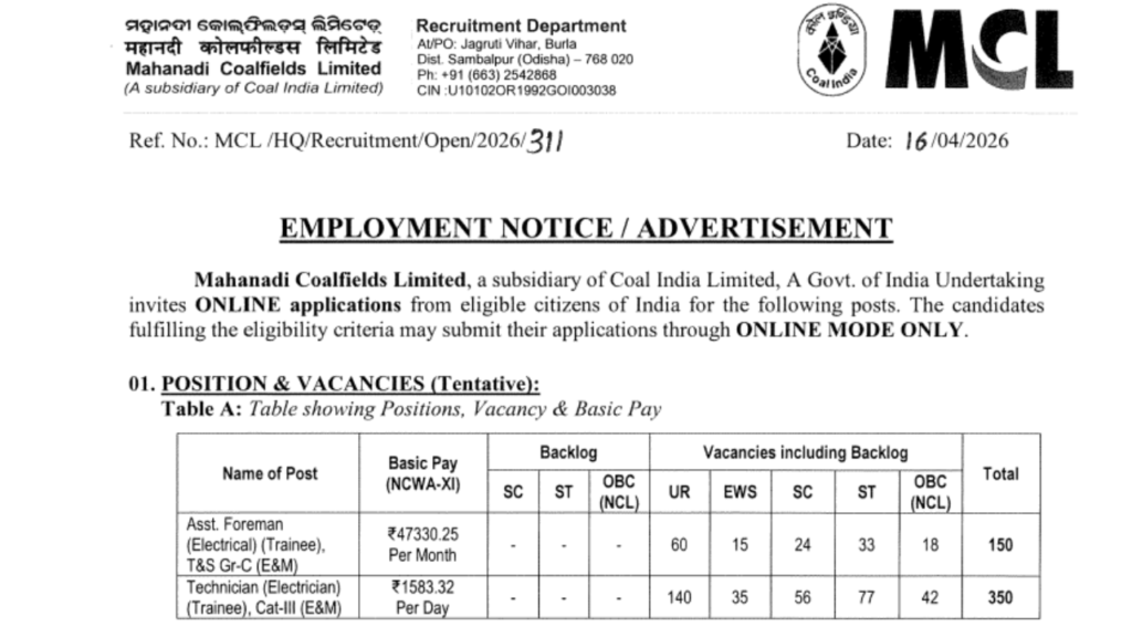 MCL Recruitment 2026, Mahanadi Coalfields Limited (MCL), a subsidiary of Coal India Limited, has released an official employment notification for multiple technical posts. This is a great opportunity for candidates looking for a government job in the coal sector. As per the latest update on freejobsupdate.com, a total of 500 vacancies have been announced for various trainee positions.