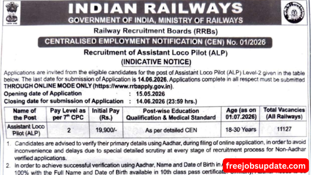 RRB ALP Recruitment 2026, The Railway Recruitment Boards (RRBs) have officially released a major recruitment notification for Assistant Loco Pilot (ALP) 2026 under CEN No. 01/2026. With 11,127 vacancies across India, this is one of the biggest government job opportunities of the year for candidates preparing for railway exams.