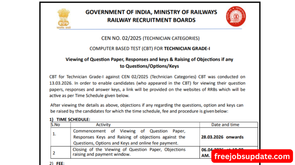 RRB Technician Answer Key 2026, The Railway Recruitment Boards (RRBs) have officially released an important update regarding the Technician Grade-I CBT Exam 2026 conducted under CEN No. 02/2025. Candidates who appeared for the exam can now view their question papers, responses, and answer keys, and also raise objections if needed.