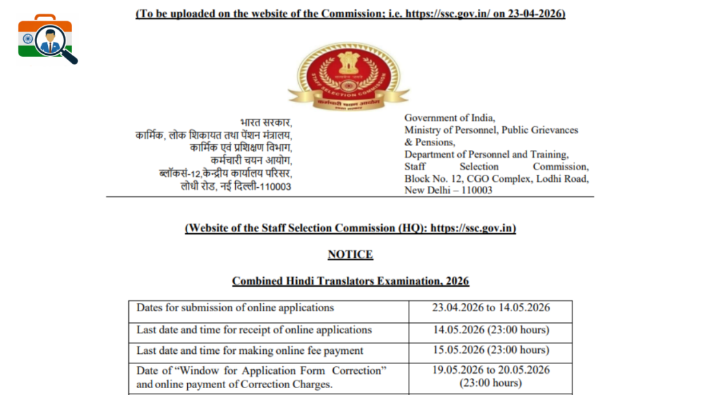 SSC CHT Recruitment 2026, The Staff Selection Commission (SSC) has officially released the notification for Combined Hindi Translators (CHT) Recruitment 2026. This recruitment drive offers a great opportunity for candidates looking to secure a Group ‘B’ Central Government job in translation services.