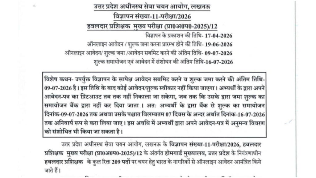 UPSSSC Havildar Instructor Recruitment 2026, The Uttar Pradesh Subordinate Services Selection Commission (UPSSSC) has officially released a notification for the Havildar Instructor Recruitment 2026. This is a great opportunity for candidates preparing for government jobs in Uttar Pradesh. A total of 209 vacancies have been announced under Advt. No. 11 Exam 2026.