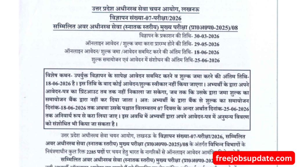UPSSSC Lower PCS Recruitment 2026, The Uttar Pradesh Subordinate Services Selection Commission (UPSSSC) has officially released the notification for the Lower PCS Recruitment 2026 under Advt. No. 07 Exam 2026. This is a great opportunity for candidates preparing for government jobs, as a total of 2285 vacancies have been announced under the Combined Lower Subordinate Services Examination.